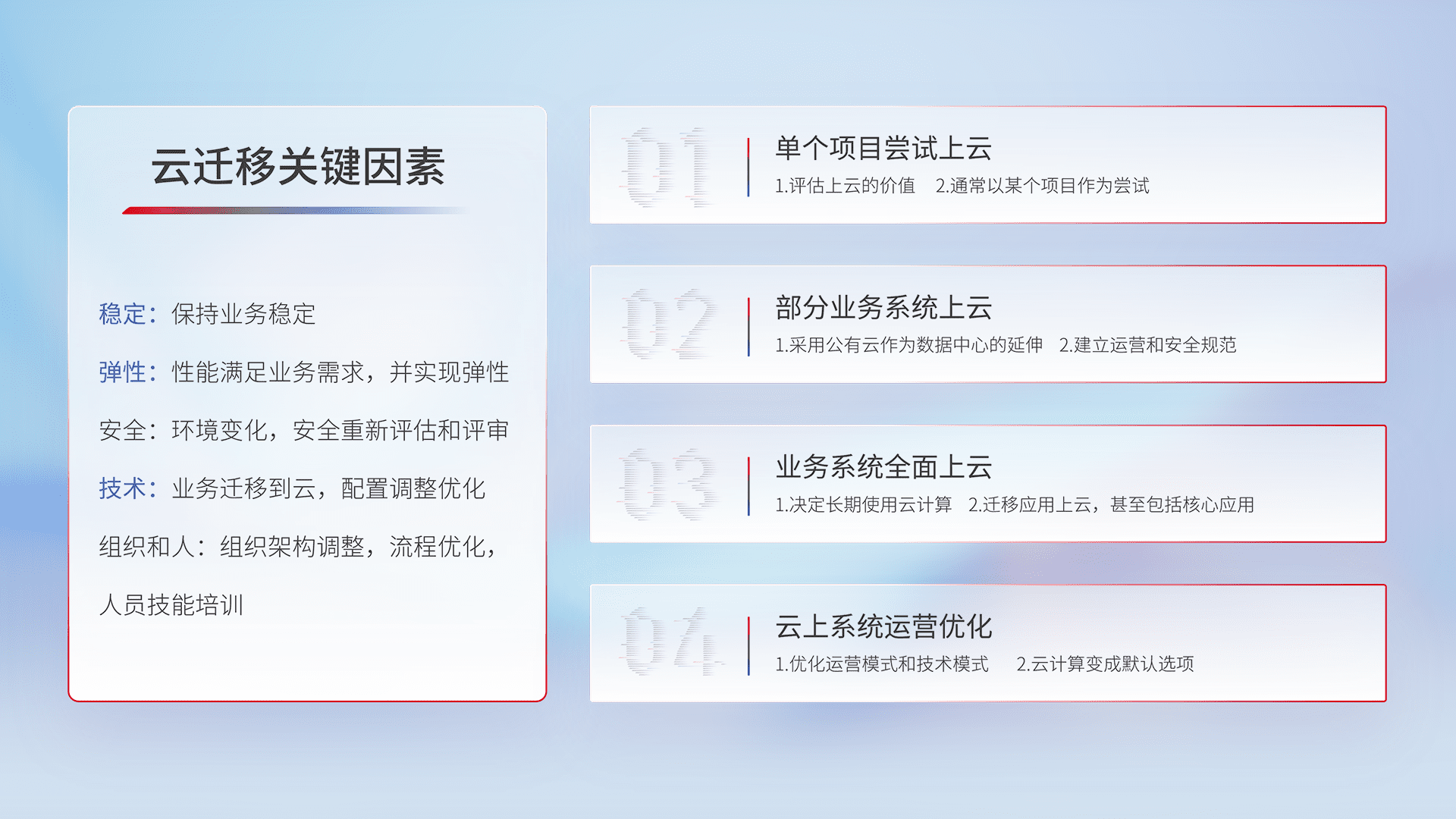 结合实际业务,,从规划设计、、、云平台选型、、、云原生改造、、、、数据迁移、、集成交付,,,迁移全过程为客户识别最佳上云路径,,做好风险识别管理,,,,设计网络架构、、身份权限、、安全审计合规、、、、操作审计、、、、日志审计、、监控告警策略、、、、多站点容灾设计等,,,,对云上基础设施进行整体规划,,,提升IT治理水平,,以满足弹性、、高可用、、、高性能的需求。。。。